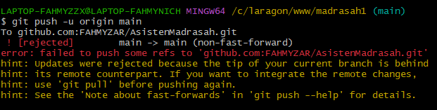 Error non-fast-forward terjadi karena branch main di repositori lokal tertahan atau tertinggal dibandingkan branch main di repositori remote (GitHub). Akibatnya, Git menolak push karena perubahan yang ada tidak bisa digabungkan secara fast-forward.