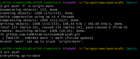 ⚠️ Peringatan: Perintah ini akan menimpa perubahan yang ada di remote. Jika ada rekan kerja yang telah mengupdate kode di remote, perubahan mereka akan hilang! Oleh karena itu, gunakan perintah ini dengan hati-hati.